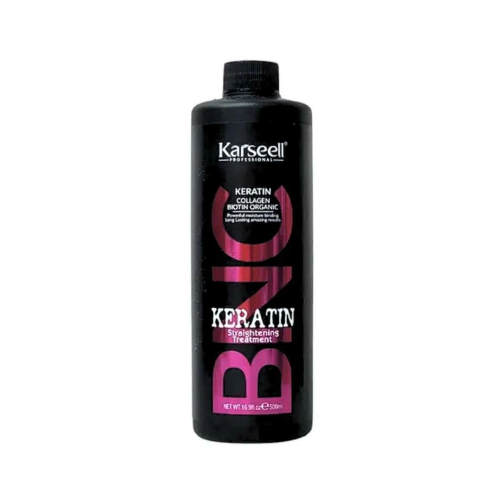 Tratamiento de Keratina con Colágeno y Biotina Karseell – 500 ml El Tratamiento de Keratina con Colágeno y Biotina Karseell es la solución ideal para lograr un cabello liso, suave y brillante. Su fórmula profesional combina queratina, colágeno y biotina, mejorando la salud y el aspecto de tu cabello. Características principales: Calidad profesional: Fortalece y repara el cabello mientras lo alisa. Acondicionamiento profundo: Hidrata, reduce el encrespamiento y previene puntas abiertas. Modo de empleo: – Lavar el cabello con shampoo neutro – Eliminar el 80% de la humedad secando con toalla – Aplicar la queratina mecha por mecha y distribuir con un peine a 5 cm de la raíz – Dejar actuar entre 25 y 30 minutos – Secar el cabello al 100% sin eliminar la queratina – Planchar mecha por mecha – Se recomienda no lavar el cabello por 24 hs o más.