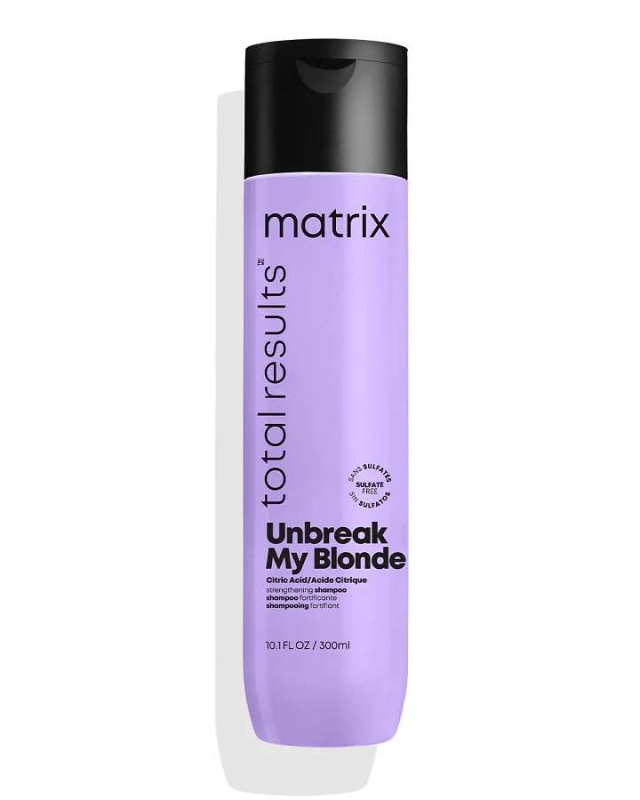 Matrix Unbreak My Blonde Shampoo está formulado especialmente para cabellos rubios y decolorados, ayudando a fortalecer y reparar la fibra capilar. Su fórmula con tecnología Bond Repair ayuda a reconstruir los enlaces capilares, reduciendo la rotura y mejorando la elasticidad del cabello. Este shampoo limpia suavemente mientras nutre el cabello, dejándolo suave, brillante y menos propenso a la fragilidad. Ideal para mantener la salud de los cabellos rubios y teñidos, previniendo el daño y restaurando su vitalidad.